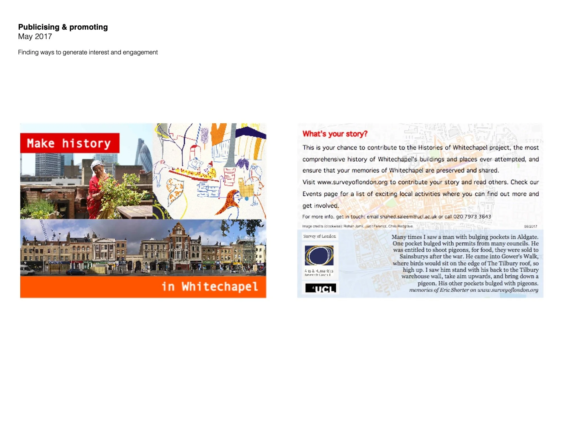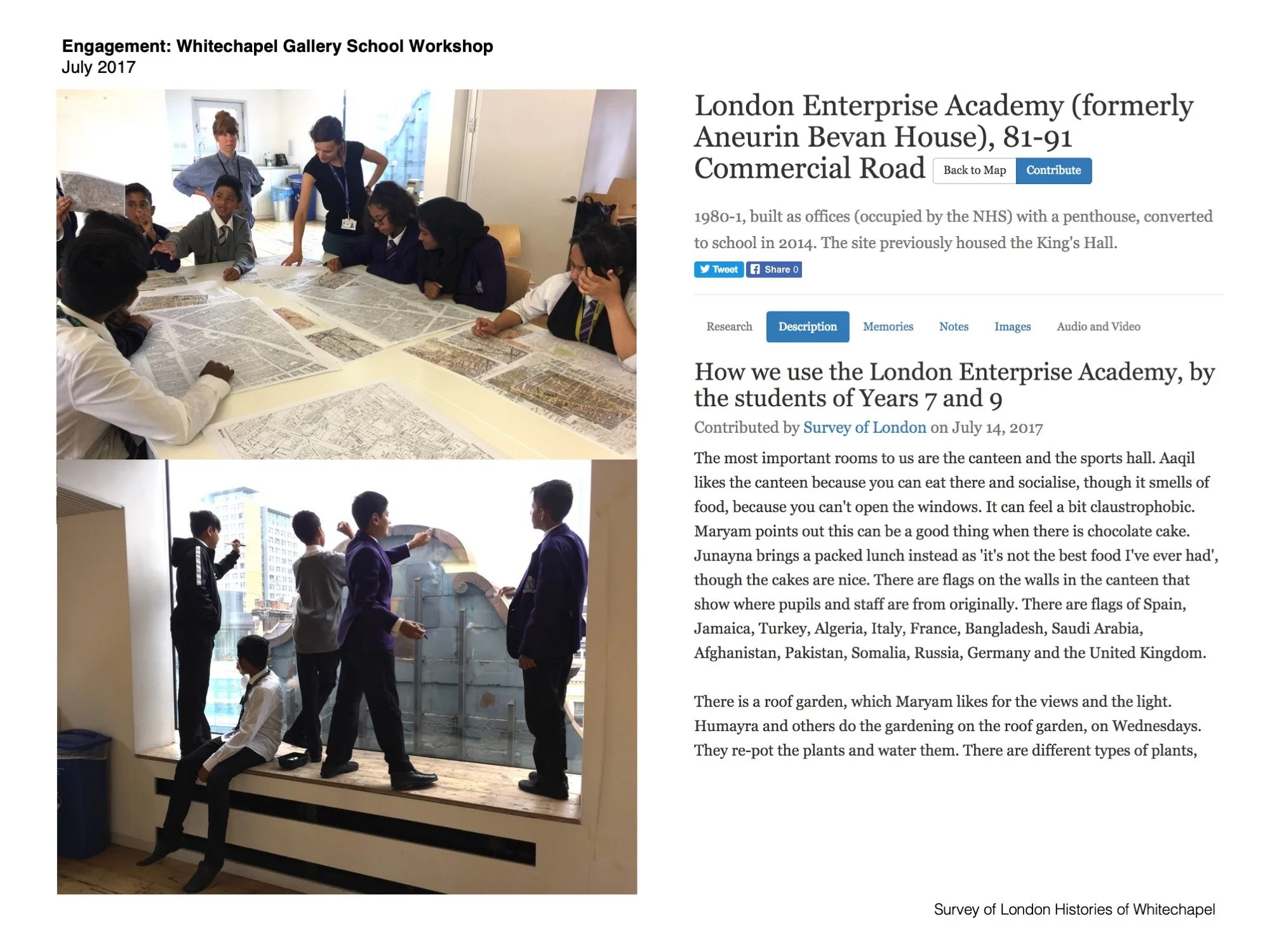 Through sustained, on-the-ground engagement, previously undocumented and alternative narratives of Whitechapel began to surface. Residents articulated the significance of local buildings not through official records but through memory, experience, and cultural association. These were histories absent from archives—stories at risk of being lost. By recording them as part of the Whitechapel project, these public and often unrepresented histories were surfaced, validated, and made publicly accessible. The project culminated in an interactive website where community histories were mapped across the neighbourhood, grounding them in the physical fabric of the area.